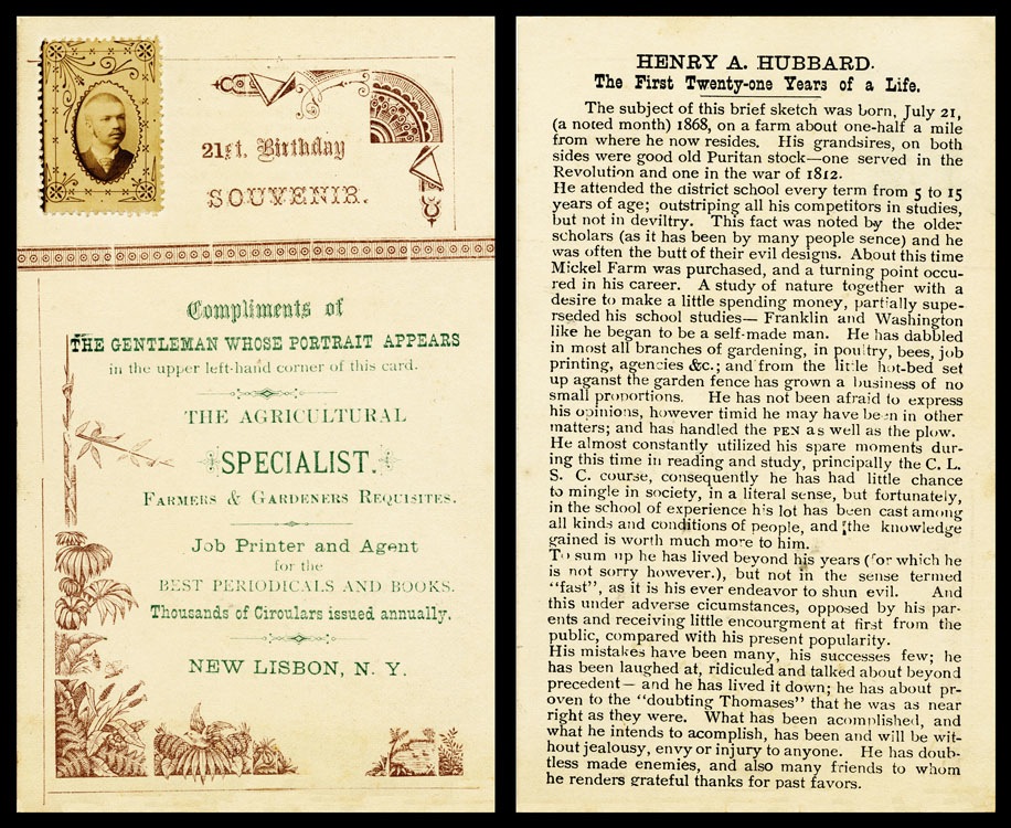 Unusually elaborate card to commemorate a boy's 21st birthday, with his photostamp affixed.