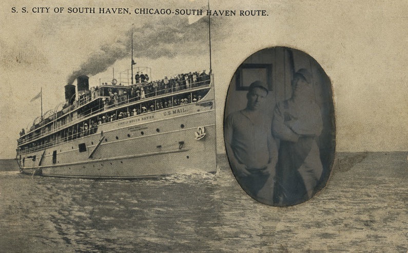 Unusual postcard, ca1900. The ship image is printed in halftone, but the image of the two men which appears in the oval window is a tintype.