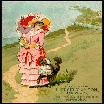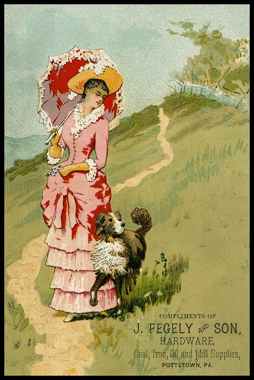 Trade card, chromolithography. Although not engraved, this card is an example of a similar soft, watercolor-like style found in some color cards of the period.