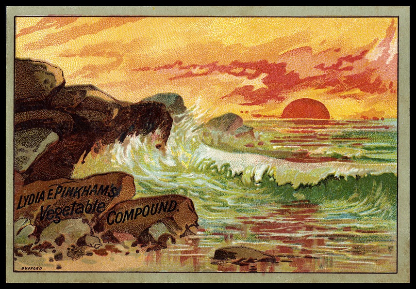 Trade card, chromolithography. Although not engraved, this card is an example of a similar soft, watercolor-like style found in some color cards of the period.