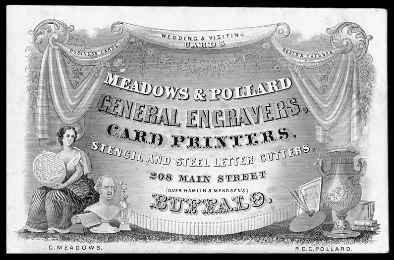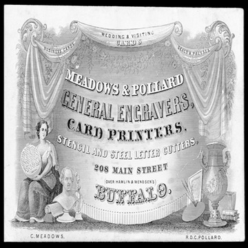 Trade card, engraved, coated stock. The round object held by the seated woman has the complete text of the Lord's Prayer, and is dated 1861.