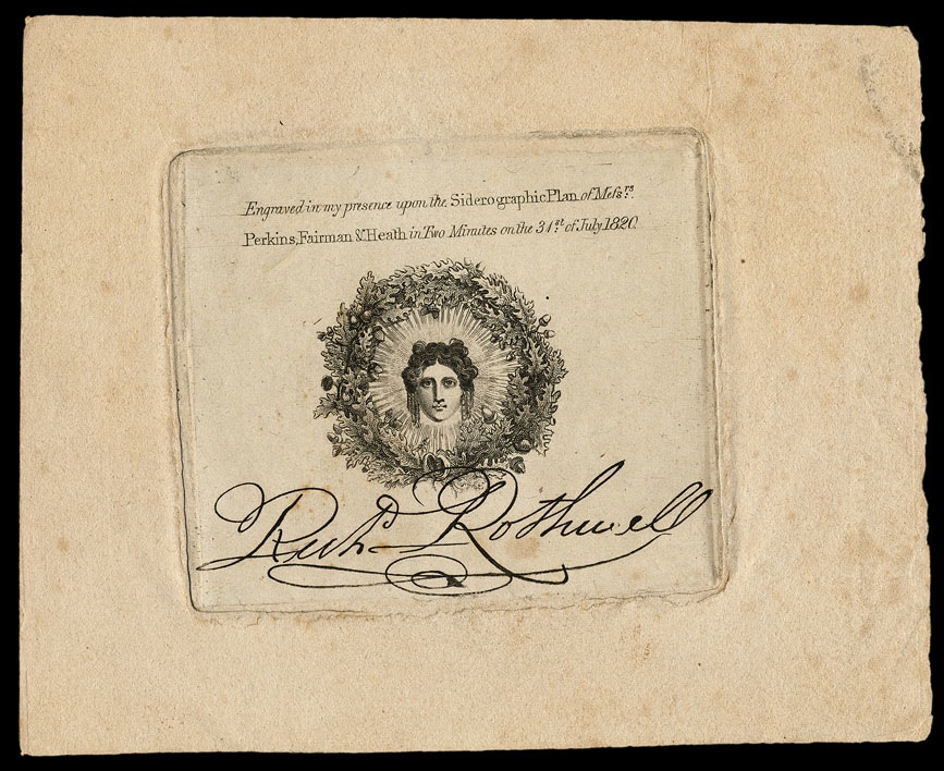 A very early (1820) proof of an engraving produced by the then-new Perkins process of siderography, using a transfer press. This process was subsequently used for most engraving work, including postage stamps, up to the present day. In a nutshell, a design was engraved into a soft steel die; that die was hardened; a soft steel "transfer roll" was rolled over the hardened die under great pressure, picking up the design in reverse; the transfer roll was hardened; and the design was then rolled in the correct position on a plate (in the case of stamps, once at each position on the plate); the plate was hardened and used to print.