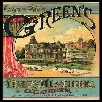 Almanac cover, 1885-1886. The rear cover features an image of Dr. Green's steam yacht G. G. Green, Jr.