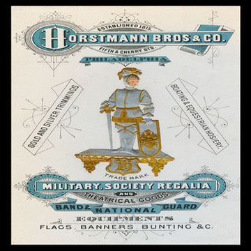 Trade card. The "knight" is embossed, and printed in silver and gold inks.