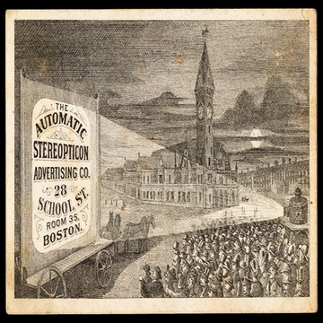 Trade card. "Works all night. It displays your Advertisement to wondering crowds. STRICTLY CASH IN ADVANCE" ( Collection of George K. Fox )